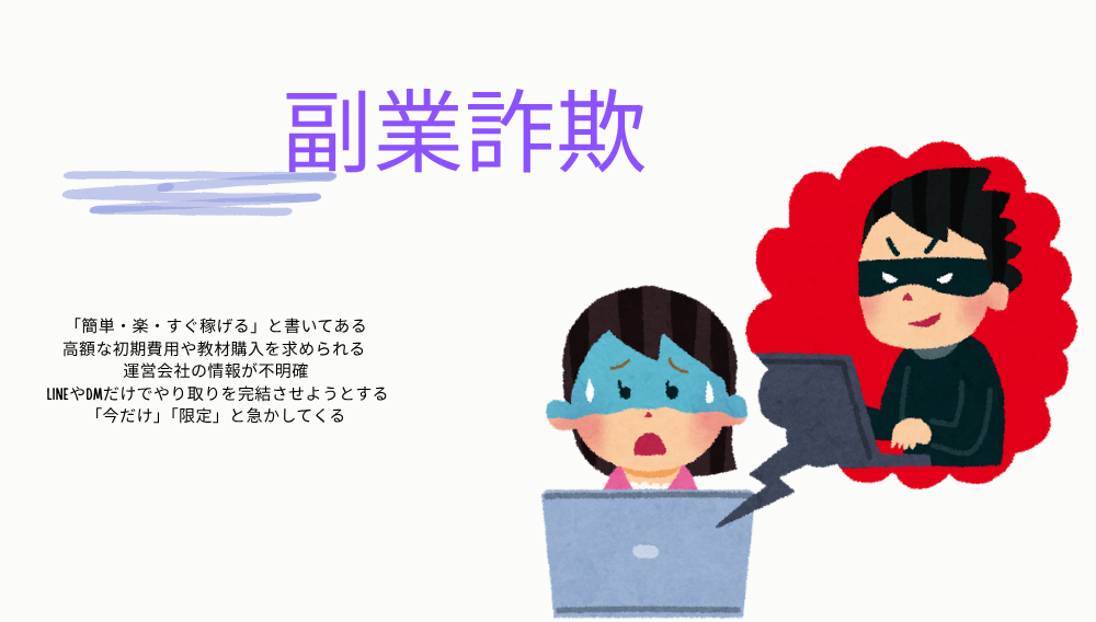 怪しい副業には「高額初期費用」「簡単に稼げる」「急かしてくる」という共通点があります。少しでも不安を感じたらすぐに立ち止まりましょう。安全に副業を始めたい方はブログから始めるのが一番です。